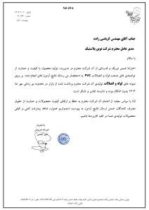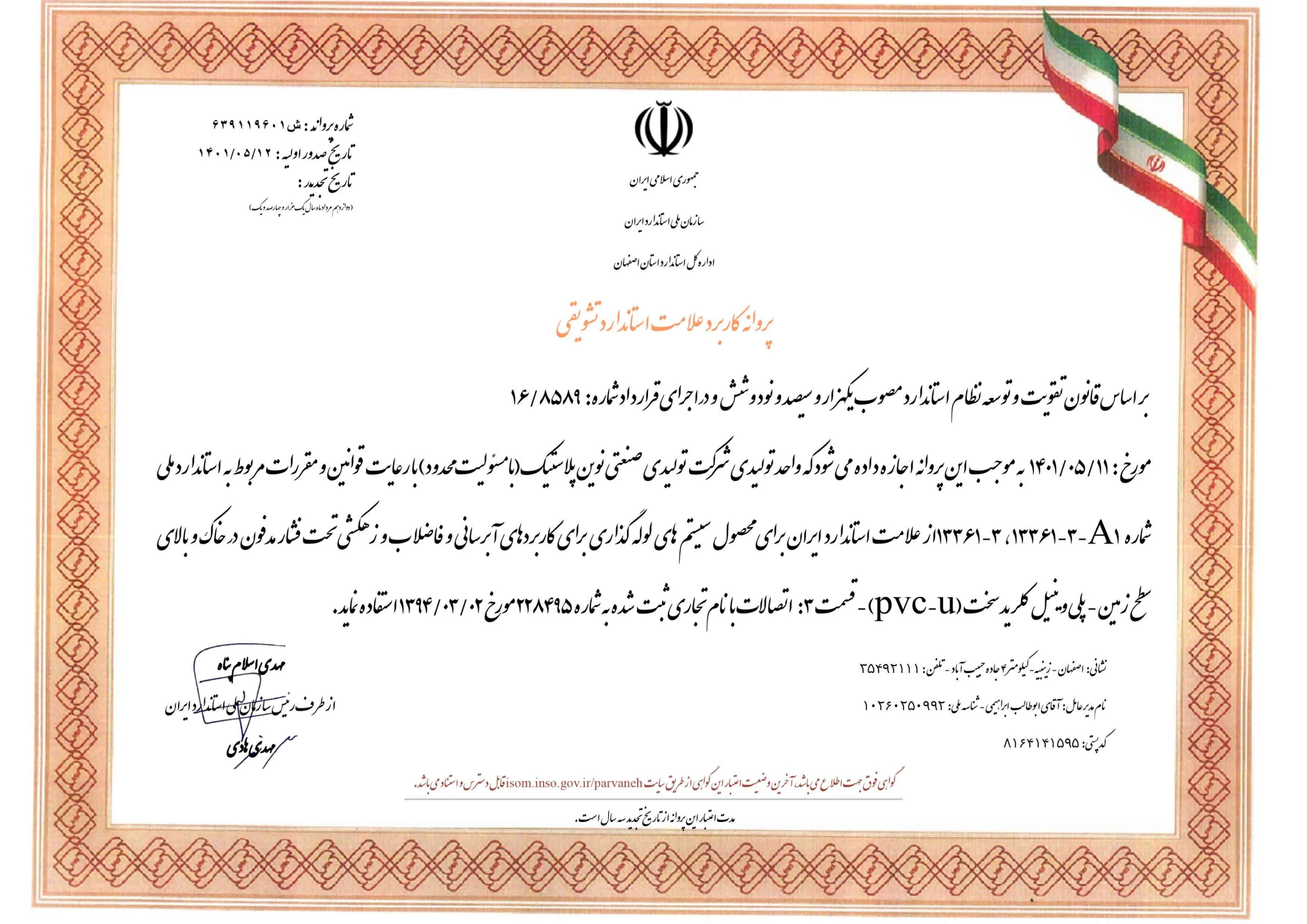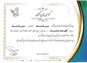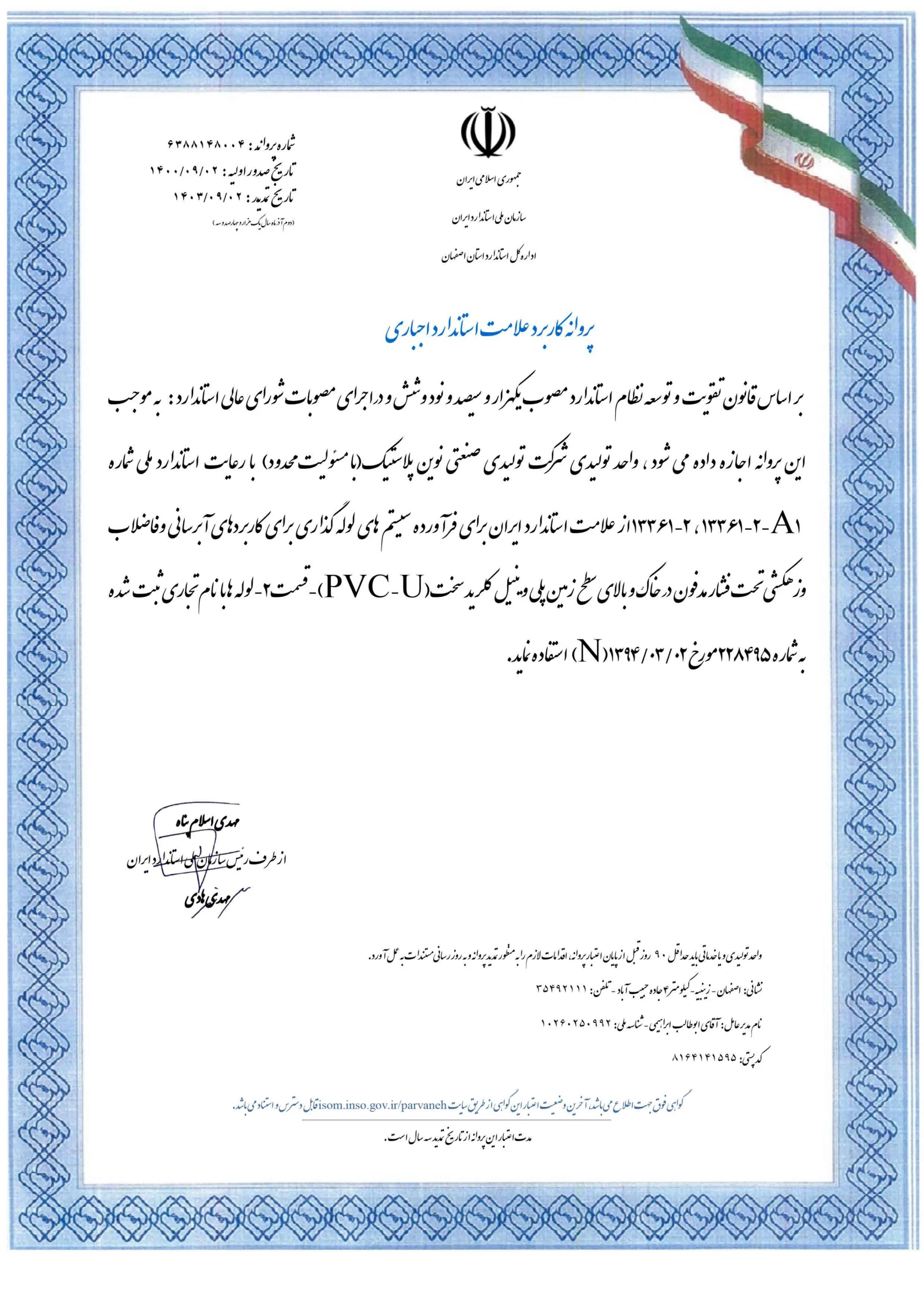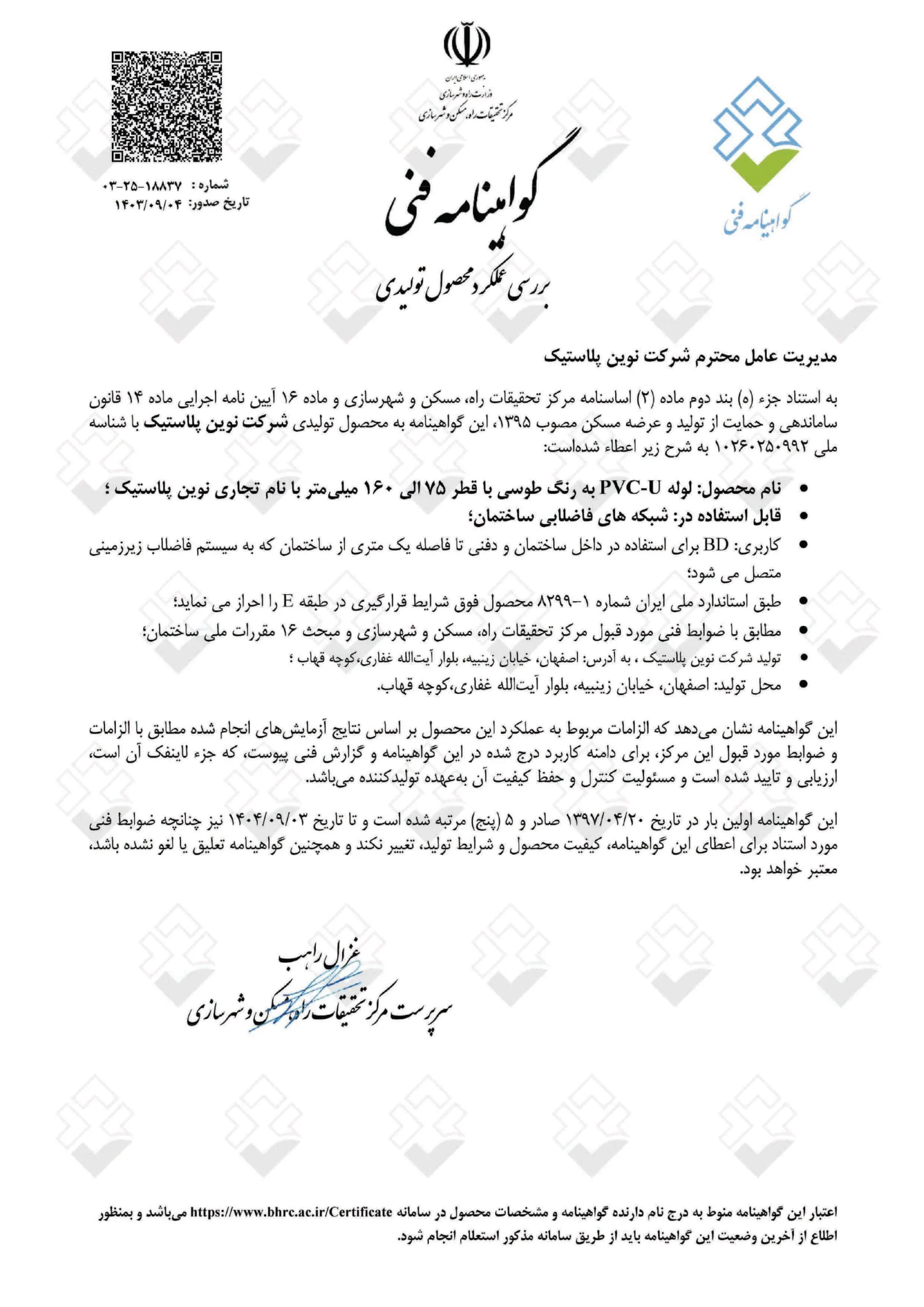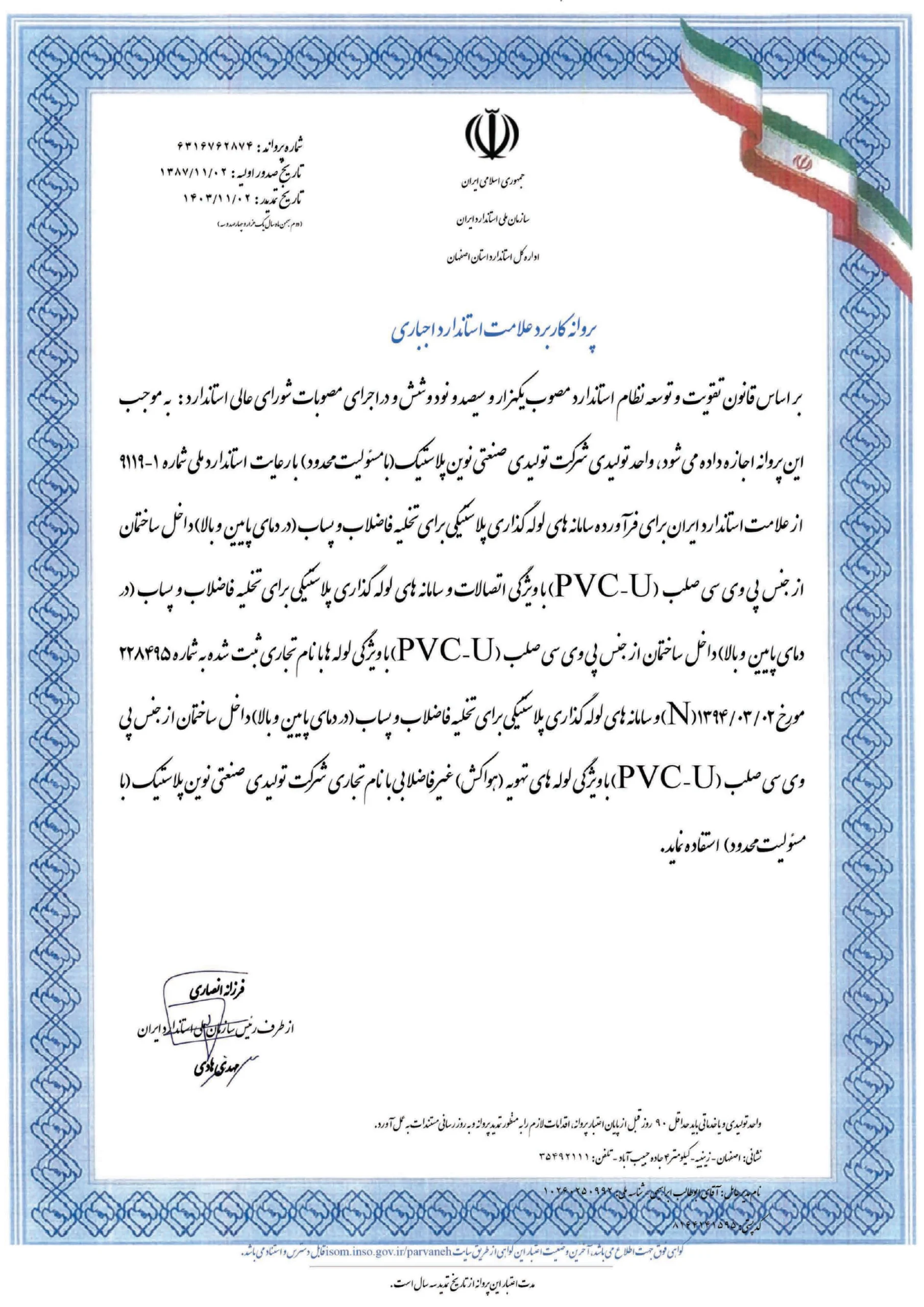نوین پلاستیک دارای گواهی‌نامه‌های معتبر از مرکز تحقیقات راه، مسکن و شهرسازی و سازمان استاندارد می‌باشد.